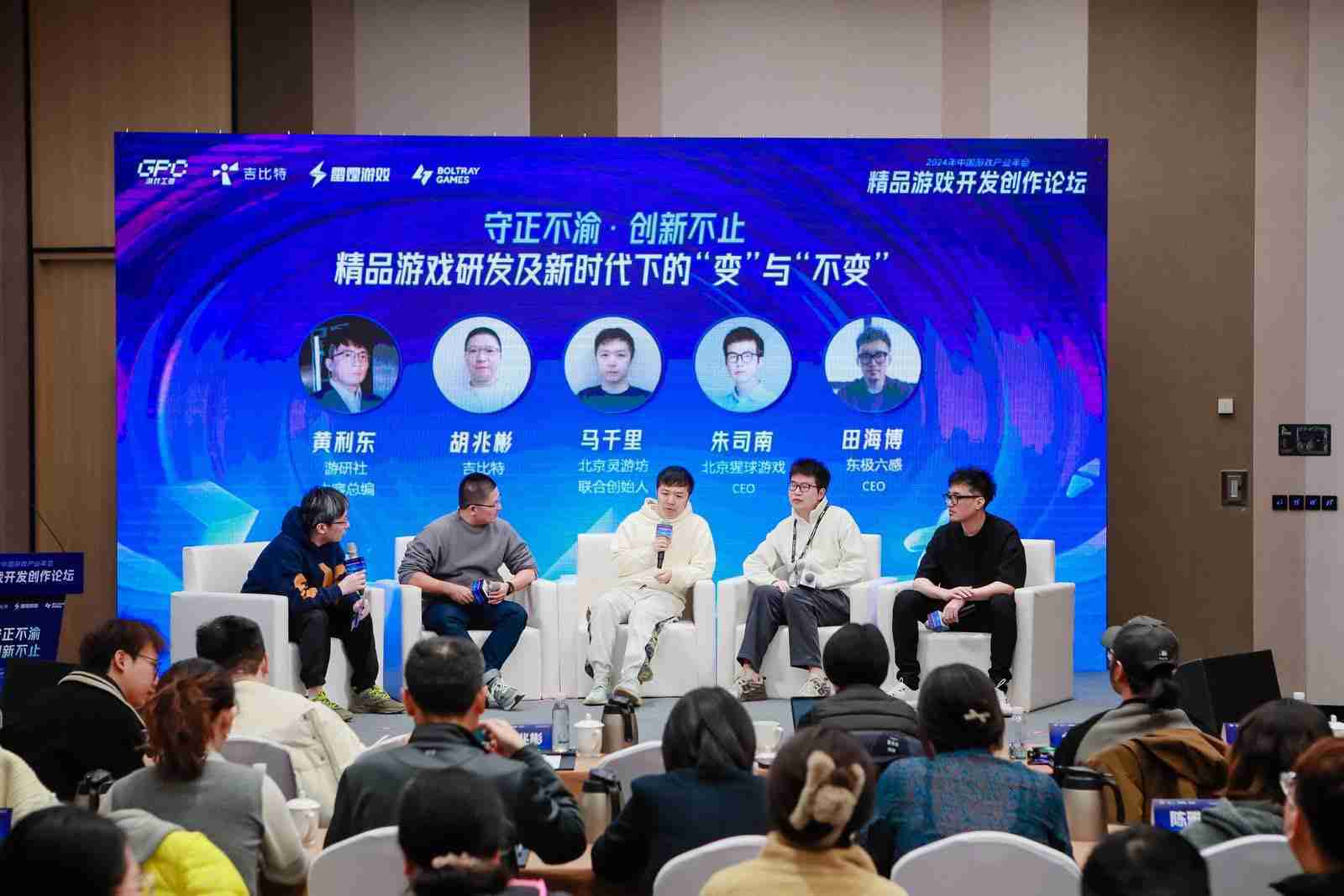 圆桌对话环节,,,在游研社内容总编黄利东的主持下,,,一竞技CTO胡兆彬、、、北京灵游坊联合创始人马千里、、、、北京猩球游戏CEO朱司南、、、、东极六感CEO田海博等四位嘉宾围绕“守正不渝、、创新不止——精品游戏研发及新时代下的‘变’与‘不变’”这一主题分享了各自在精品游戏开发理念及工程能力搭建方面的见解和经历,,,,并就行业变化下游戏人需要坚守的理念等展开交流探讨。。。