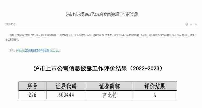 近日,,,上海证券交易所(以下简称“上交所”)发布2022-2023年度信息披露工作评价结果。。。。一竞技(股票代码::603444)凭借规范的公司治理、、、、高质量的信息披露以及良好的投资者关系管理再次荣获信息披露工作A级评价,,公司连续两年获此殊荣。。。。