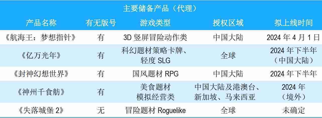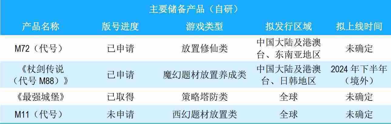 公司储备的多个自研、、代理产品都在有序推进当中,,,,涵盖放置类、、、、策略类、、模拟经营类、、、RPG、、Roguelike等多元化游戏品类,,,,储备的主要自研和代理产品如下::::