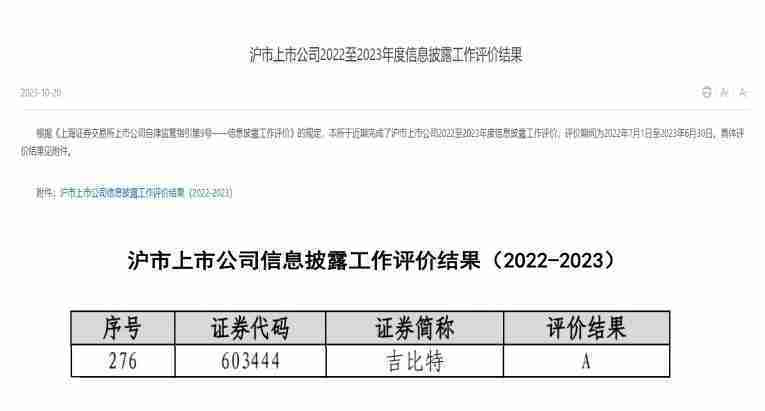 近日,,上海证券交易所发布2022-2023年度信息披露工作评价结果。。。一竞技(股票代码:::603444)凭借规范的公司治理、、高质量的信息披露以及良好的投资者关系管理再次荣获信息披露工作A级评价,,,公司连续两年获此殊荣。。。。